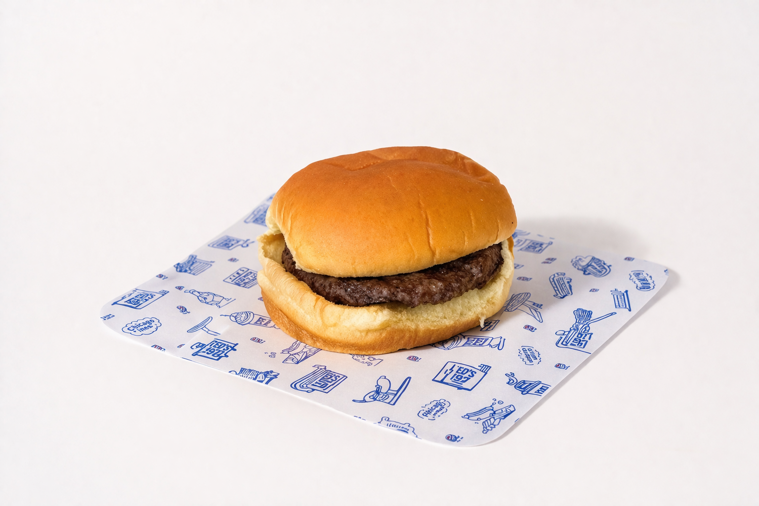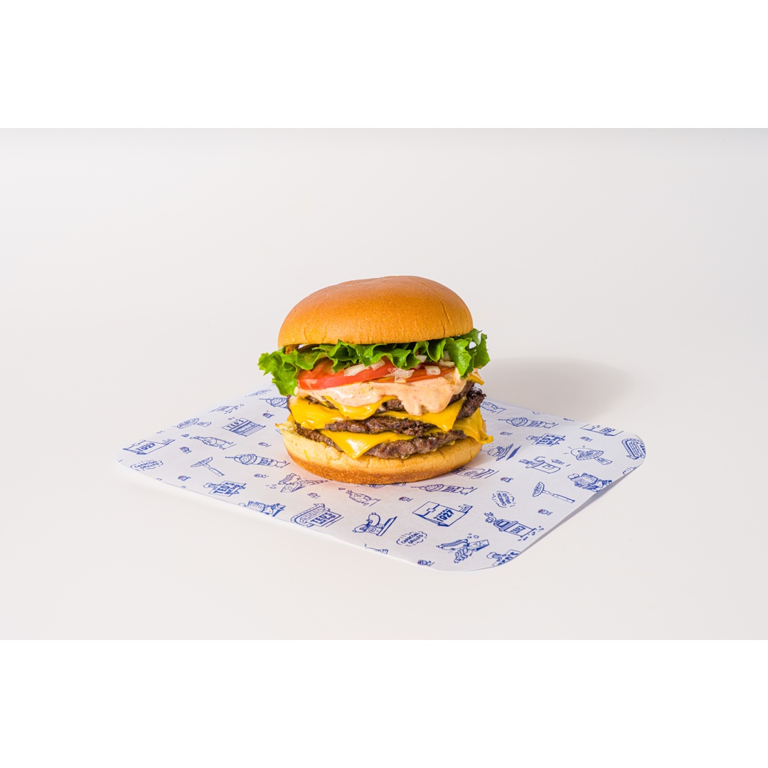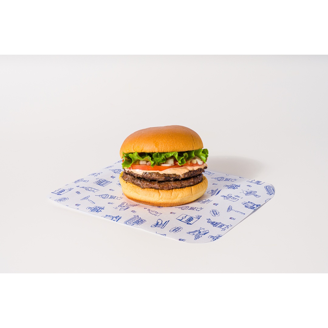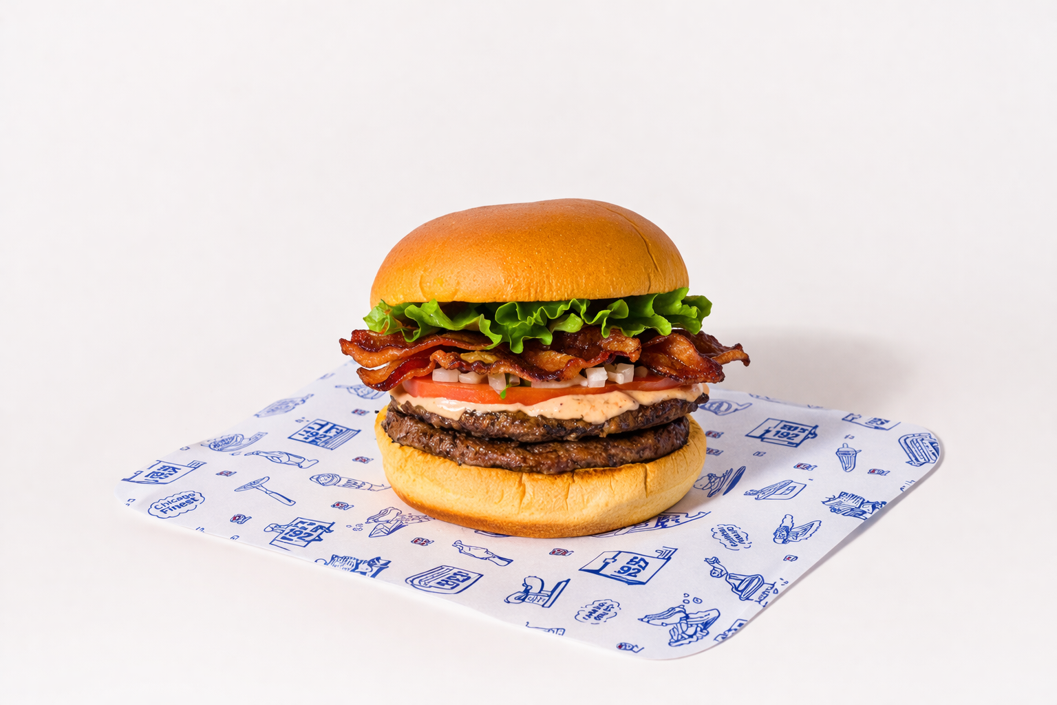 Two 1/5 lb. Certified Angus beef burger patties with bacon and American cheese served on a Martin's potato roll.
