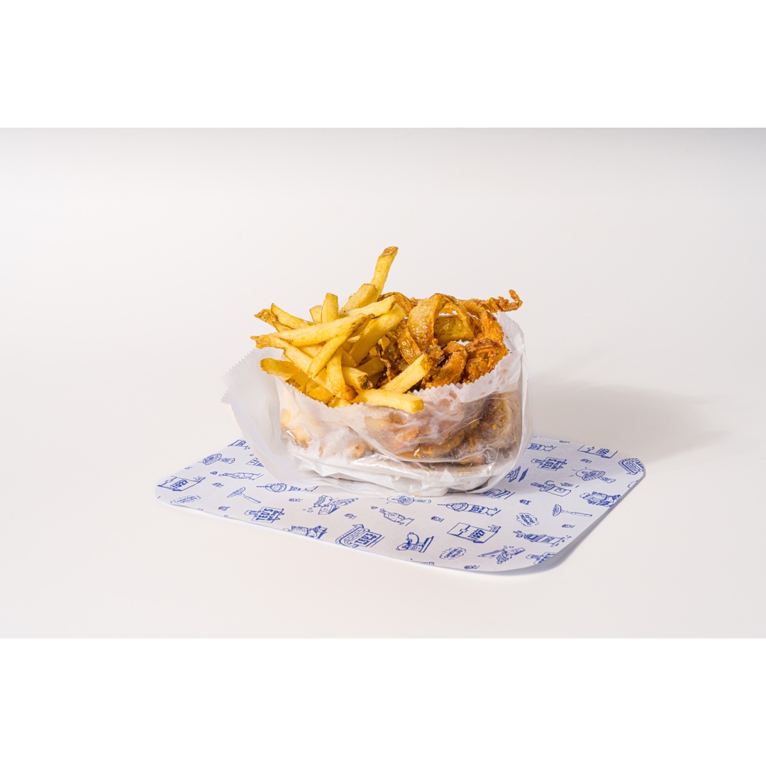 1/5 lb certified Angus beef burger, fries or apple sauce, and a kiddy sized drink or milk.