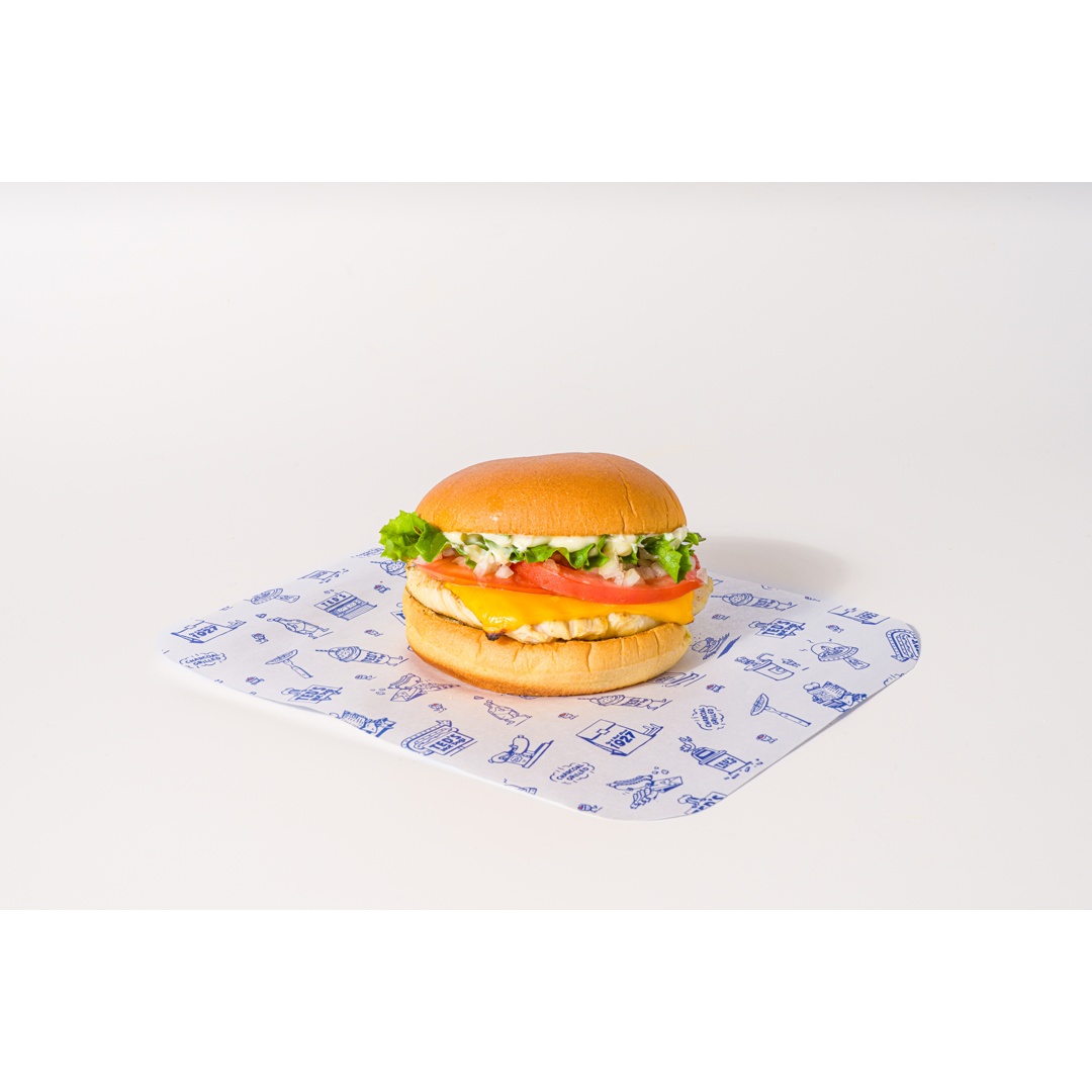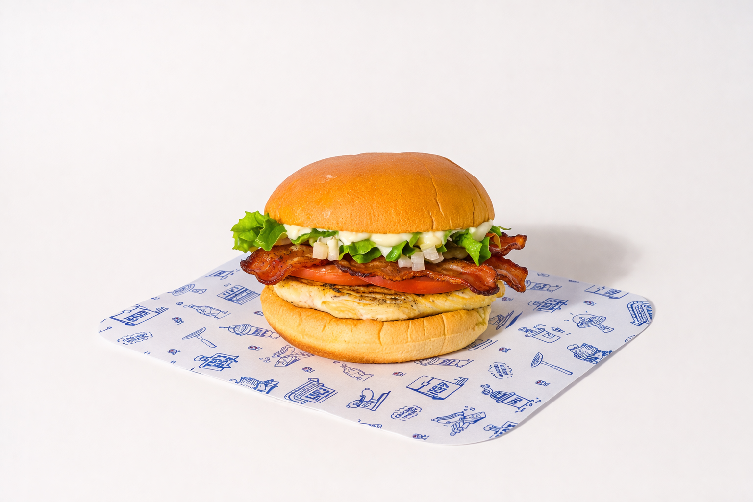 All natural, hormone free 4 oz chicken breast with bacon, lettuce, tomato and cheese.