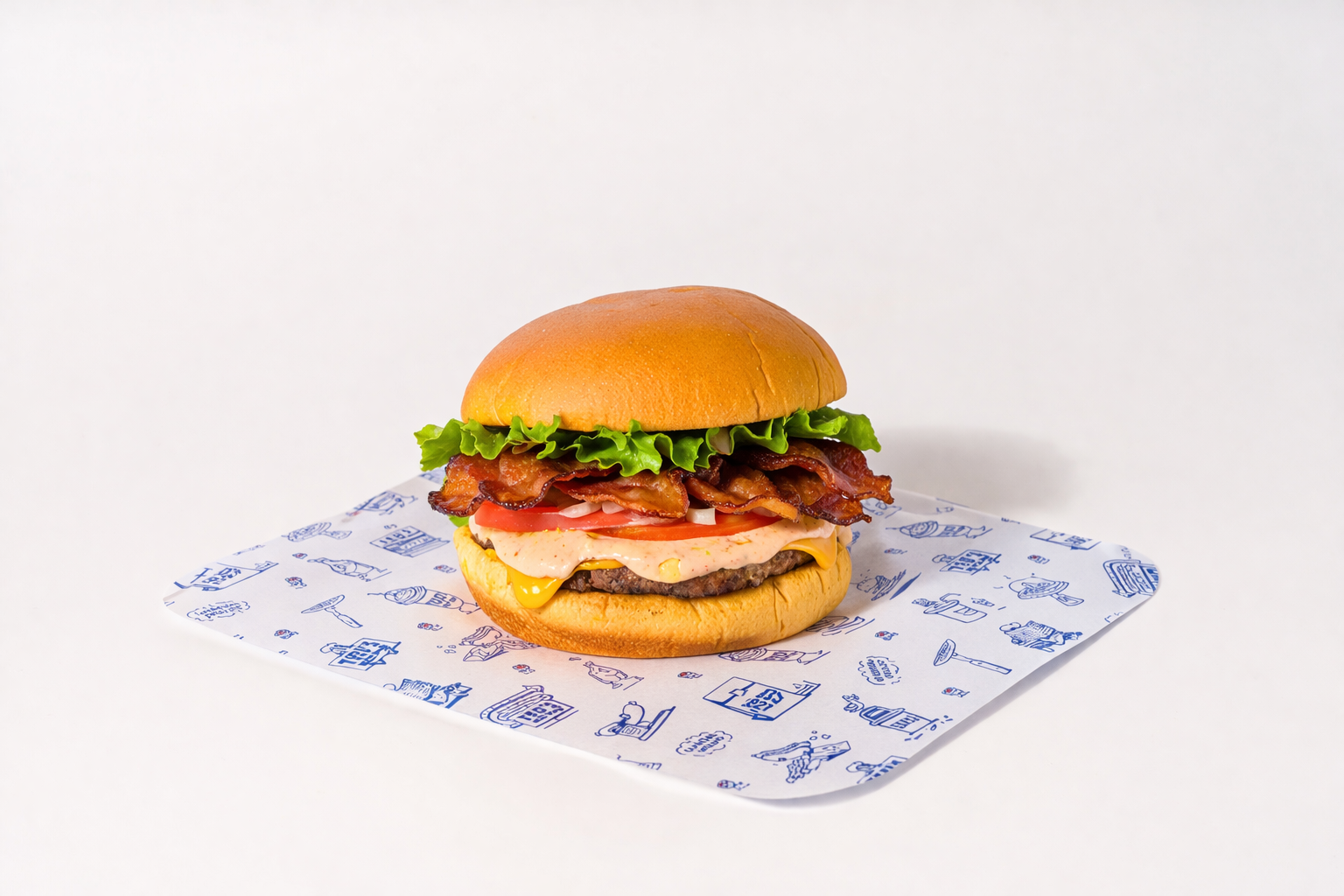 1/5 lb. Certified Angus beef burger patty with bacon and American cheese served on a Martin's potato roll.