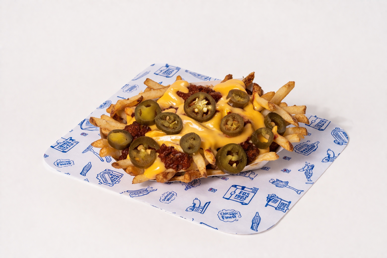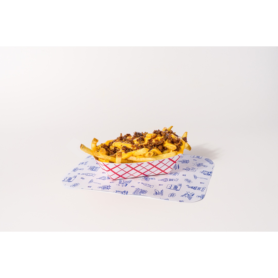 Crumbled bacon and melted cheddar cheese with a regular sized order of fries