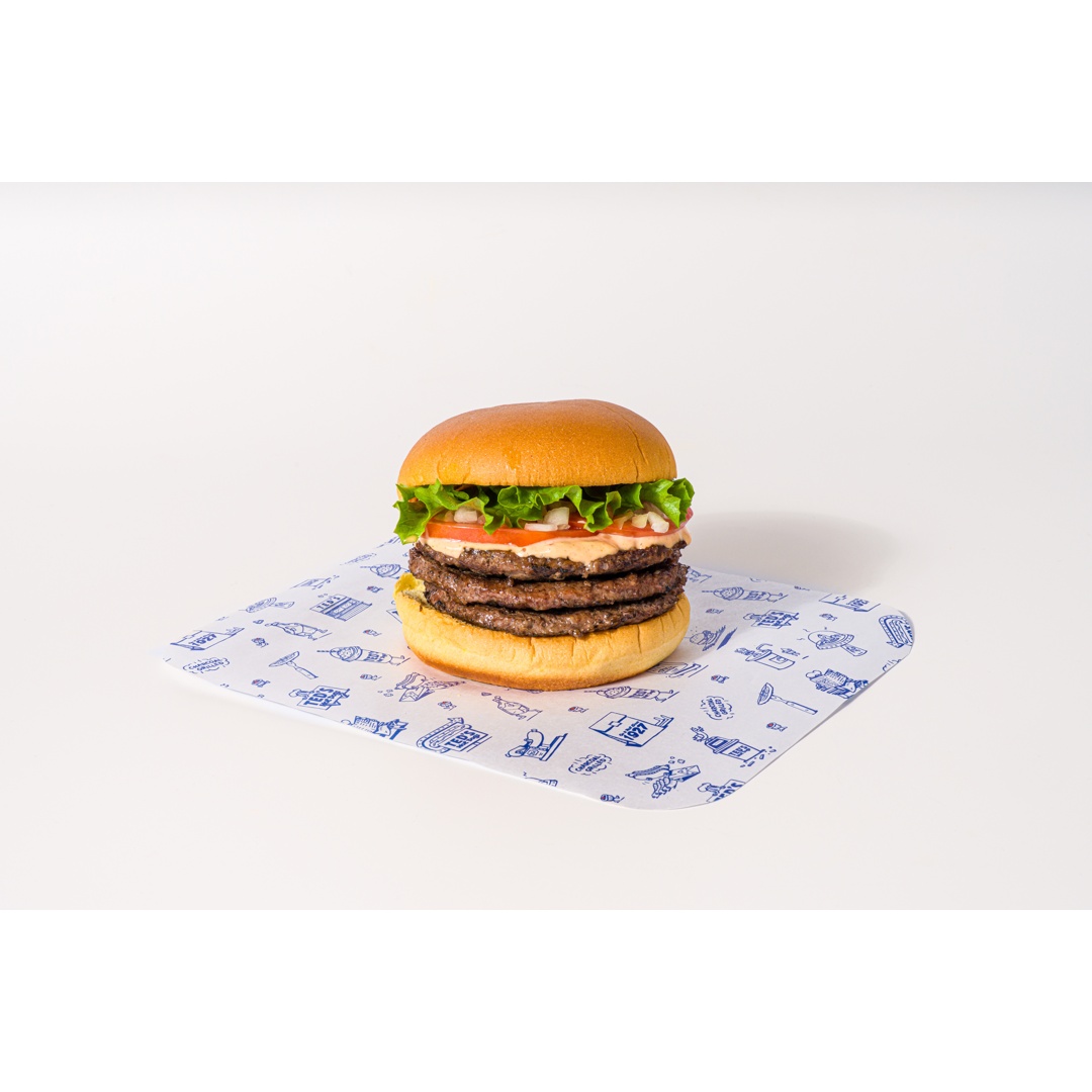 Three 1/5 lb. Certified Angus beef burger patties with bacon and American cheese served on a Martin's potato roll.